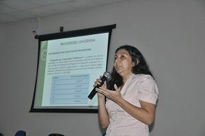 Logo após a apresentação da proposta do PAC 2014 foi a vez da TAE Sergia Colares explanar sobre as progressões por capacitação e por qualificação as quais os servidores técnicos fazem jus. Sergia sanou as dúvidas quanto a progressão por capacitação no que diz respeito à carga horária dos cursos, o ambiente organizacional e o interstício exigido entre uma progressão e outra.